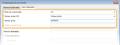Defina o modo de comunicação e o número de fax (ou URI).