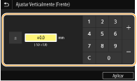 Quando ajustar a posição de impressão, especifique a direção utilizando "+" e "-" e a distância utilizando "mm". Para <Ajustar Verticalmente (Frente)>/<Ajustar Verticalmente (Traseira)>, especifique um valor com um sinal "+" para mudar a posição de impressão na direção de cima para baixo. Para <Ajustar Horizontal. (Frente)>/<Ajustar Horizontal. (Traseira)>, especifique um valor com sinal "+" para mudar a posição de impressão na direção da esquerda para a direita. Para mudar na direção contrária, especifique um valor com sinal "-".