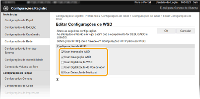 Selecione a caixa de verificação para obter informações relativas à máquina a partir de um computador através de WSD. Esta caixa de verificação é selecionada automaticamente quando é selecionada a caixa de verificação [Usar Impressão WSD]. [Usar Digitalização WSD]