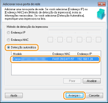 Selecione [Deteção automática], selecione a máquina quando esta for detetada e clique em [Avançar].