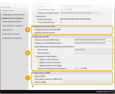 Selecione a caixa de verificação para atualizar os registos DNS dinamicamente, sempre que o endereço IP da máquina for alterado. Para especificar o(s) tipo(s) de endereços que pretende gravar no servidor DNS, selecione a caixa de verificação de [Registrar Endereço Manual], [Registrar Endereço Declarável] ou [Registrar Endereço Sem Estado]. Para especificar o intervalo entre atualizações, introduza o tempo em horas na caixa de texto [Intervalo de Atualização de DNS Dinâmico]. [Configurações de mDNS][Usar mDNS]