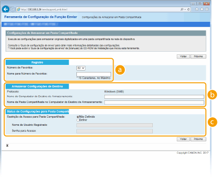 Com a Ferramenta de Configuração da Função Enviar, pode registar uma pasta partilhada para guardar documentos digitalizados em <Favoritos> no livro de endereços. Selecione um número na lista pendente.