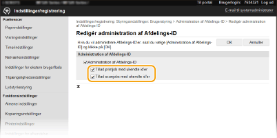 Indstilling af administration af afdelings-id'er til job fra computeren). Hvis afkrydsningsfeltet er valgt for denne indstilling, udføres jobbene dog, også selv om der ikke er indtastet id og pinkode. Hvis du ønsker at konfigurere en indstilling, så der ikke udføres noget job, med mindre korrekt afdelings-id og pinkode bliver indtastet, skal du fjerne markeringen i afkrydsningsfeltet.