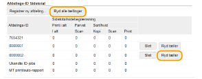 Nulstil optællingerne ved at klikke på det tilsvarende tekstlink under [Afdelings-ID], og klik derefter på [Ryd tæller]  [OK]. Nulstil alle optællingerne for alle afdelings-id'er ved at klikke på [Ryd alle tællinger]  [OK].