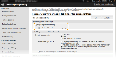 Der vises ingen godkendelsesskærm, når der sendes e-mail eller I-faxer. Godkendelse på SMTP-serveren udføres ved hjælp af det brugernavn og den adgangskode, der er angivet i [Indstillinger for e-mail/I-fax] Konfiguration af kommunikationsindstillinger for e-mail/I-fax.
