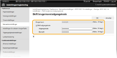 Hvis du vil indstille eller ændre adgangskoden, skal du markere afkrydsningsfeltet og angive alfanumeriske tegn for den nye adgangskode både i tekstfeltet [Adgangskode] og [Bekræft]. |