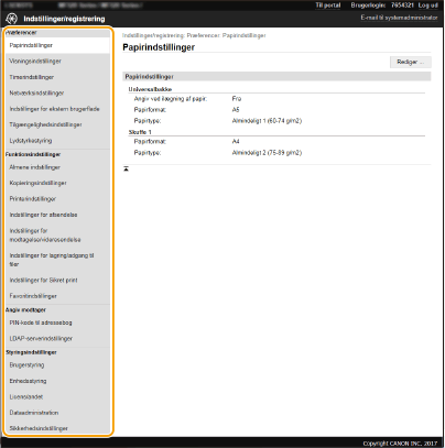 Du kan ændre de forskellige indstillinger for maskinen ved at bruge Brugerinterface til fjernbetjening. De fleste indstillinger kan også angives i maskinen, men nogle indstillinger kan kun angives ved at bruge Brugerinterface til fjernbetjening. I dette afsnit beskrives den grundlæggende proces for at ændre maskinens indstillinger ved hjælp af Brugerinterface til fjernbetjening.