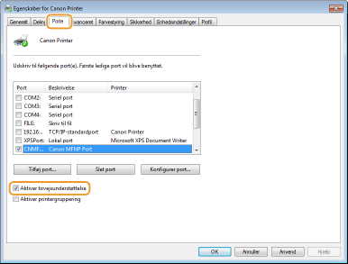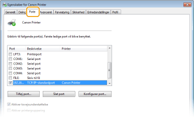 Hvis [Beskrivelsen] for den valgte port er [Canon MFNP Port], og hvis maskinen og computeren er på det samme undernet, så vil forbindelsen blive bevaret. Du behøver ikke at tilføje en ny port. Hvis du bruger [Standard TCP/IP Port], så har du brug for at tilføje en ny port. Konfiguration af printerport