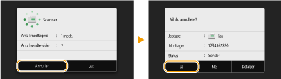 Hvis du vil annullere afsendelse af faxer, så snart der er valgt <Start>, skal du vælge <Annuller> på displayet eller trykke på  på kontrolpanelet. Du kan også annullere afsendelsen af faxer, når du har kontrolleret faxens status.