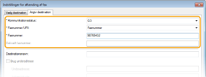 Når feltet [Bekræft faxnummer] eller [Bekræft URI] er aktivt, skal du også angive det relevante nummer i feltet. Indstillingen for, om det indtastede nummer skal bekræftes, kan ændres på skærmen faxdriver. Klik på [Hjælp] for at få flere oplysninger om skærmen for faxdriver.