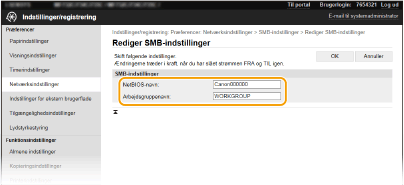 SMB (Server Message Block) er en protokol til deling af ressourcer, f.eks. filer og printere, hvor der er flere end én enhed på et netværk. Maskinen anvender SMB til at gemme scannede dokumenter i en fælles mappe. Afhængigt af dit netværk kan det være nødvendigt at angive NetBIOS-navn og arbejdsgruppenavn.