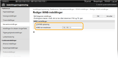 Hvis IP-adressen for WINS-serveren er hentet fra en DHCP-server, vil den hentede IP-adresse have forrang i forhold til den IP-adresse, der er angivet i tekstfeltet [WINS-serveradresse].