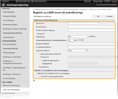 Vælg [Brug ikke], [Brug] eller [Brug (sikkerhedsautent.)], afhængigt af godkendelsestype, der er implementeret af LDAP-serveren. Når [Brug] eller [Brug (sikkerhedsautent.)] er valgt, skal brugernavnet og adgangskoden angives.