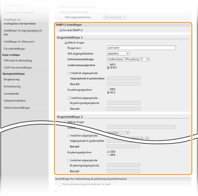 SNMP (Simple Network Management Protocol) er en protokol til overvågning og styring af kommunikationsenheder på et netværk ved hjælp af MIB (Management Information Base). Maskinen understøtter SNMPv1 og den sikkerhedsudvidede SNMPv3-udgave. Du kan kontrollere statussen på maskinen fra en computer, når du udskriver dokumenter eller bruger Brugerinterface til fjernbetjening. Du kan aktivere enten SNMPv1 eller SNMPv3 eller begge på samme tid. Angiv indstillingerne for hver version, så de passer til dit netværksmiljø og anvendelsens formål.