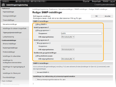 Hvis begge SNMP-versioner er aktiveret, anbefales det, at MIB-adgangstilladelse i SNMPv1 angives til [Skrivebeskyttet]. MIB-adgangstilladelsen kan indstilles uafhængigt i SNMPv1 og SNMPv3 (og for hver bruger i SNMPv3). Hvis [Læs/skriv] (fuld adgangstilladelse) vælges i SNMPv1, negerer det de robuste sikkerhedsfunktioner, der er et kendetegn ved SNMPv3, fordi de fleste af maskinindstillingerne så kan kontrolleres med SNMPv1.