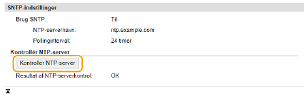 Du kan se kommunikationsstatus med den registrerede server ved at klikke på [Indstillinger/registrering]  [Netværksindstillinger]  [Kontrollér NTP-server] i [SNTP-indstillinger]. Hvis der er etableret en korrekt forbindelse, vises resultatet som vist herunder. Bemærk, at denne handling ikke justerer systemuret.