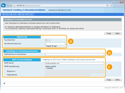 Værktøjet til indstilling af afsendelsesfunktionen hjælper dig med at konfigurere de grundlæggende indstillinger for afsendelse af e-mails. I stedet for Værktøjet til indstilling af afsendelsesfunktionen kan du bruge Brugerinterface til fjernbetjening til at konfigurere mere detaljerede indstillinger, som f.eks. indstillinger for POP-godkendelse, før du sender eller til krypteret kommunikation. Konfiguration af kommunikationsindstillinger for e-mail/I-fax