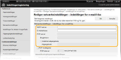 Brug Brugerinterface til fjernbetjening til at konfigurere de detaljerede indstillinger for afsendelse og modtagelse, f.eks. indstillingerne for brug af maskinen til at afsende og modtage I-faxer og indstillingerne for POP-godkendelse og kryptering af kommunikation, inden du sender e-mail eller I-faxer. Kontakt din udbyder eller netværksadministrator vedrørende de krævede indstillinger.