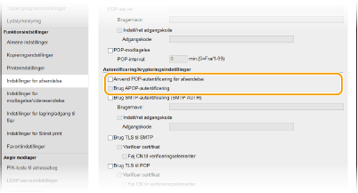 For at bruge POP3-serveren til godkendelse for autentificering før du sender e-mail eller I-faxer, skal du markere afkrydsningsfeltet.