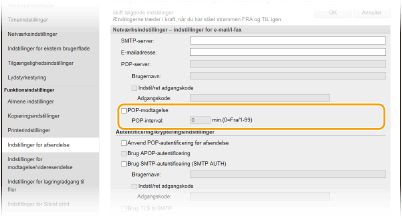 Dette angiver det interval (i minutter), som bruges til automatisk oprettelse af forbindelse til POP3-serveren. Hvis der er I-fax-dokumenter på serveren, modtages og udskrives de automatisk.