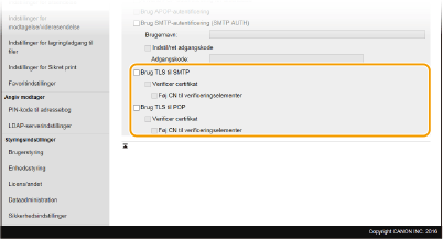 Markér afkrydsningsfeltet for at anvende TLS til kryptering af kommunikation med SMTP-server. Markér afkrydsningsfeltet for [Verificer certifikat] eller [Føj CN til verificeringselementer] afhængigt af dine behov.