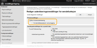 Ingen autentiseringsskjermbilde vises når e-poster eller I-fakser sendes. Autentisering på SMTP-serveren utføres med brukernavnet og passordet angitt i [Innstillinger for e-post/I-Fax] Konfigurere kommunikasjonsinnstillinger for e-post/I-faks.