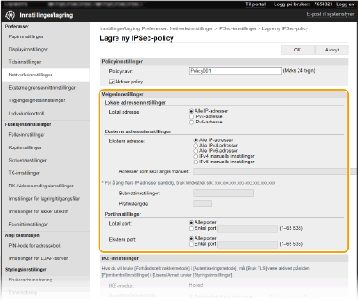 Velg å angi én enkelt IPv4-adresse eller et område med IPv4-adresser for å bruke IPSec. Angi IPv4-adressen (eller området) i tekstboksen [Adresser som skal angis manuelt].