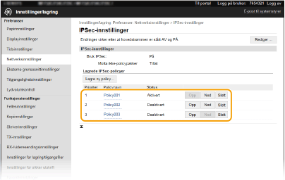 Bruke betjeningspaneletDu kan også aktivere eller deaktivere IPSec-kommunikasjon fra <Meny> på Hjem-skjermen. <Bruk IPSec>