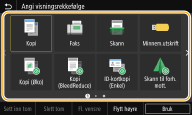 Du kan legge til snarveisknapper til Hjem-skjermbildet for ofte brukte funksjoner som <Kopi>, <Faks> og <Skann>. For eksempel kan du utføre oppgaver raskere og mer effektivt ved å tilordne en serie med innstillinger (f.eks. "Skann begge sider av et dokument, lagre det som en PDF-fil med høy komprimering og send det via e-post") til én enkel knapp.