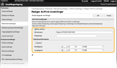 Du kan angi om det skal utføres utskrift eller sending av faks med AirPrint. Standardinnstilling fra fabrikk er<På>.