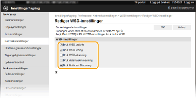 Merk av i avkrysningsboksen for å bruke WSD-skanning ved å betjene maskinen via betjeningspanelet. Denne avkrysningsboksen kan kun velges når avkrysningsboksen [Bruk WSD-skanning] er valgt. Velg <Skann> på Hjem-skjermen og angi en WSD-tilkoblet datamaskin som skannemottaker, når du vil skanne (Skanne og lagre til en datamaskin). [Bruk Multicast Discovery]