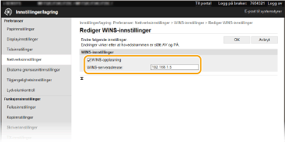 Du må angi NetBIOS-navn og navn på arbeidsgruppe for å kunne angi WINS-serverinnstillinger. Konfigurere SMB