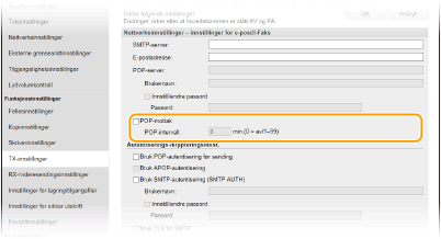 Dette stiller inn intervallet (i minutter) som brukes for automatisk tilkobling til POP3-serveren. Hvis det er noen I-faksdokumenter på serveren, blir de automatisk mottatt og skrevet ut.