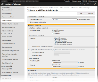 Valitse tämä, kun haluat määrittää yksittäisen IPv4-osoitteen tai IPv4-osoitealueen, johon IPSec-protokollaa käytetään. Syötä IPv4-osoite (tai osoitealue) [Manuaalisesti asetettavat osoitteet] -tekstiruutuun.