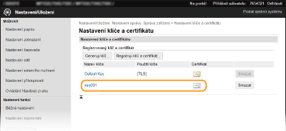 Klíč a certifikát nelze smazat, jestliže se z nějakého důvodu aktuálně používají, např. když je v části [Použití klíče] uvedeno „[TLS]“ nebo „[IEEE 802.1X]“. V takovém případě je před smazáním nutné příslušnou funkci zakázat nebo klíč a certifikát vyměnit.