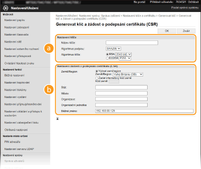 Zadejte nastavení pro klíč a CSR.