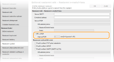 Nastaví interval (v minutách), který se použije k automatickému připojení k serveru POP3. Jsou-li na serveru nějaké i-faxy, budou automaticky přijaty a vytištěny.