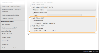 Toto políčko zaškrtněte, chcete-li komunikaci se serverem POP3 šifrovat pomocí protokolu TLS. Podle potřeby můžete zaškrtnout políčko [Ověřit certifikát] a [Přidat CN k položkám pro ověření].