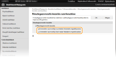 Számítógépről végezhető részlegazonosító-kezelés beállítása a feladatokhoz). Ha azonban e beállításnál bejelölték a jelölőnégyzetet, a rendszer akkor is végrehajtja a feladatokat, ha a felhasználó nem adja meg az azonosítót és a PIN-kódot. Ha szeretné elérni, hogy a megfelelő részlegazonosító és PIN-kód megadása nélkül ne lehessen feladatokat végrehajtani, törölje a jelet a jelölőnégyzetből.