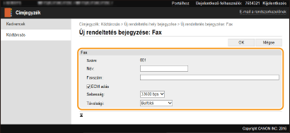 A kezelőpanel <Faxbeállítások> ( <Küldés>) menüpontjában az [ECM adás] és a [Sebesség] is beállítható. Mindazonáltal a <Címjegyzék> adataiból végzett beállítások a Címjegyzékbe bejegyzett rendeltetési helyek részletes beállításaihoz vannak engedélyezve.