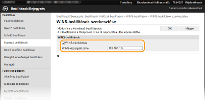 Ha a WINS-kiszolgálónak DHCP-kiszolgáló ad IP-címet, akkor a kapott IP-cím felülbírálja a [WINS-kiszolgáló címe] szövegmezőben megadott IP-címet.