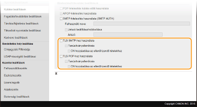 Az SMTP-kiszolgálóval folytatott kommunikáció TLS-titkosításához jelölje be a jelölőnégyzetet. Igény szerint jelölje be a [Tanúsítványellenőrzés] vagy [CN hozzáadása az ellenőrizendő tételekhez] jelölőnégyzetet.