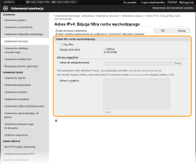 Nieprawidłowo wprowadzone adresy IP mogą uniemożliwić dostęp do urządzenia z poziomu Zdalnego interfejsu użytkownika. Konieczne będzie wtedy ustawienie filtra <Filtr adresów IPv4> albo <Filtr adresów IPv6> na <Wyłącz>.