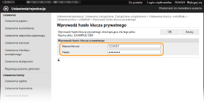 Wybierz kolejno pozycje [Zarządzanie urządzeniem]  [Ustawienia klucza i certyfikatu] albo [Ustawienia certyfikatu CA].