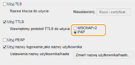 Zaznacz pole wyboru [Użyj TTLS] albo [Użyj PEAP].