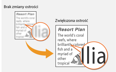 Ostrość obrazu można dostosować. Można zwiększyć ostrość w celu wyostrzenia niewyraźnego tekstu i linii lub zmniejszyć ostrość, aby poprawić wygląd fotografii z magazynu. Regulacja ostrości
