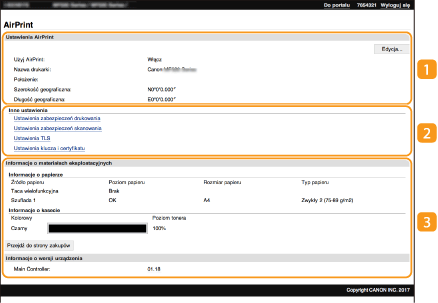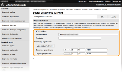 Pozwala sprawdzić wartości wprowadzone w ustawieniach AirPrint, takie jak nazwa i lokalizacja urządzenia. Przycisk [Edycja] pozwala zmienić ustawienia.