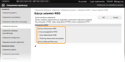 Zaznaczenie tego pola wyboru umożliwia uzyskanie informacji o urządzeniu przez komputer za pomocą interfejsu WSD. To pole wyboru jest zaznaczane automatycznie po zaznaczeniu pola wyboru [Użyj drukowania WSD]. [Użyj skanowania WSD]