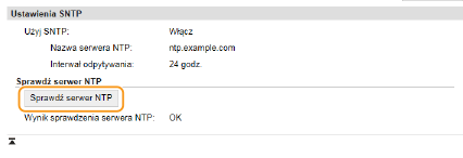 Sprawdzanie komunikacji z serwerem NTP/SNTPStatus komunikacji z zarejestrowanym serwerem można wyświetlić, klikając [Ustawienia/rejestracja]