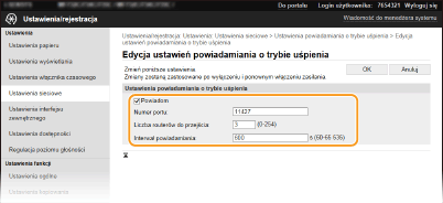 Zaznaczenie tego pola wyboru umożliwia powiadamianie oprogramowania do zarządzania urządzeniami o stanie zasilania urządzenia. Zaznaczenie opcji [Powiadom] pozwala na uniknięcie nawiązywania przez urządzenie zbędnej komunikacji w trybie uśpienia i zmniejszenie całkowitego zużycia energii. [Numer portu]